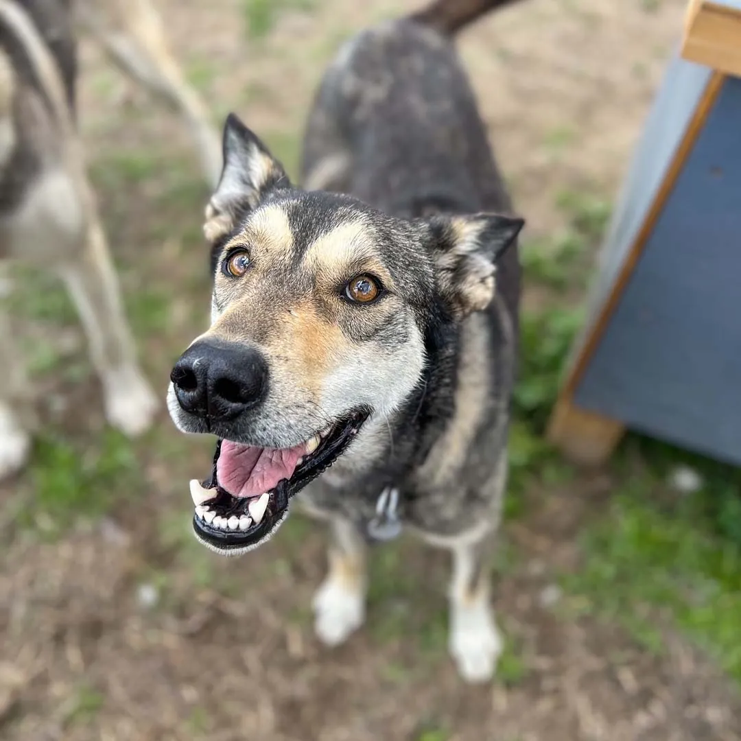Alaskan Husky. Ranger is a 7 year old that came to us from Northern Nevada. He didn’t have much socialization when we got him, so he is very shy. Ranger avoids most people, but is so affectionate to people he knows. He’s always smiling at us and is the happiest guy. His brother Rocket and Ruger are his best doggie friends in the yard.