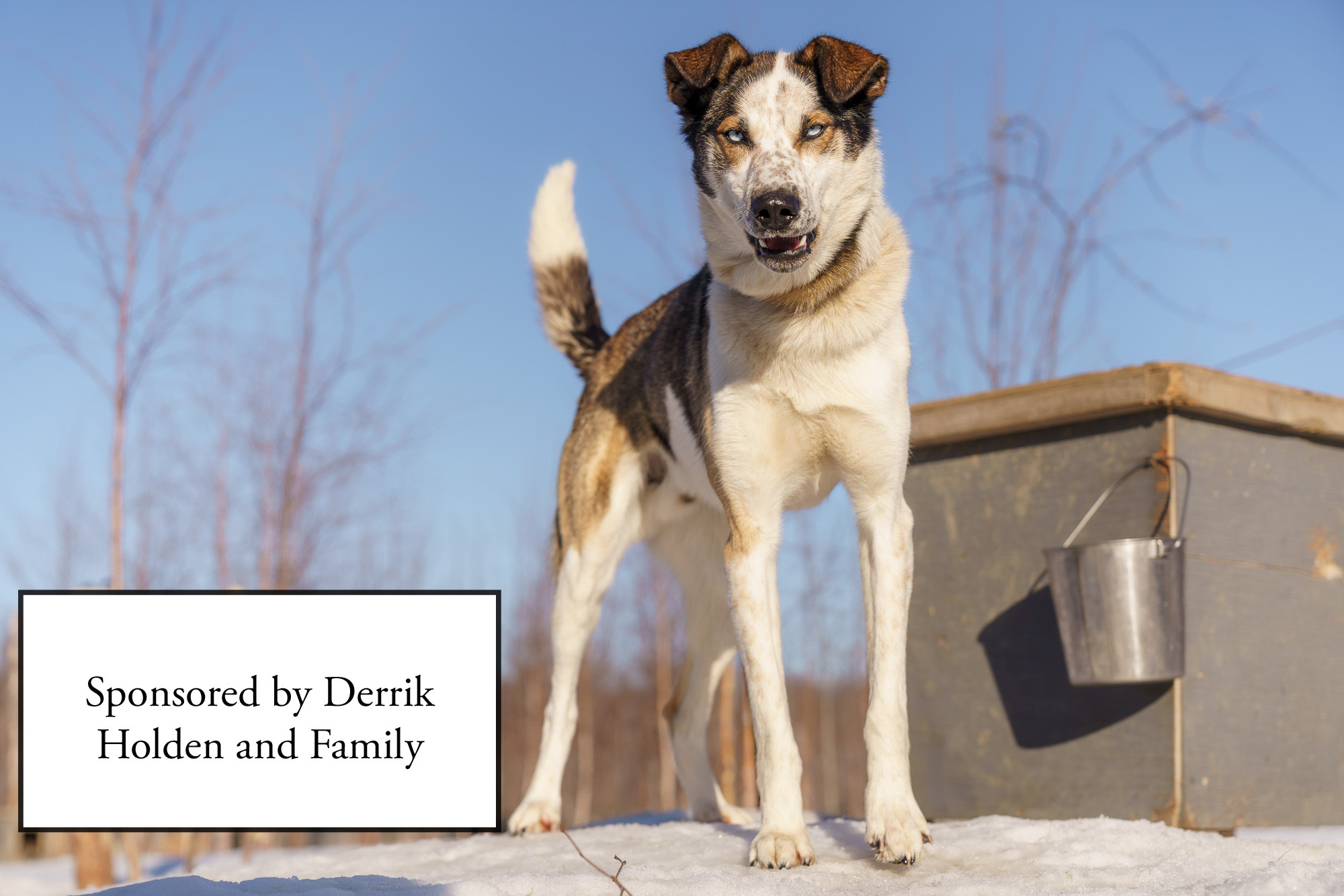 Alaskan Husky. 10 Years old. Fiddler is usually the first dog to greet you when you arrive. His bright blue eyes and unique coloring makes him one of our most recognizable dogs. He’s infamous for loving cuddles and pushing his head into your legs as a way to hug you. He was born at Rohn’s parents’ kennel in 2013, where Rohn raised him. Fiddler ran the Iditarod with Rohn in 2015 and is a steady leader on our team. When he’s not in harness Fiddler loves to cuddle on the couch and spend time alone in his private room (our guest room).